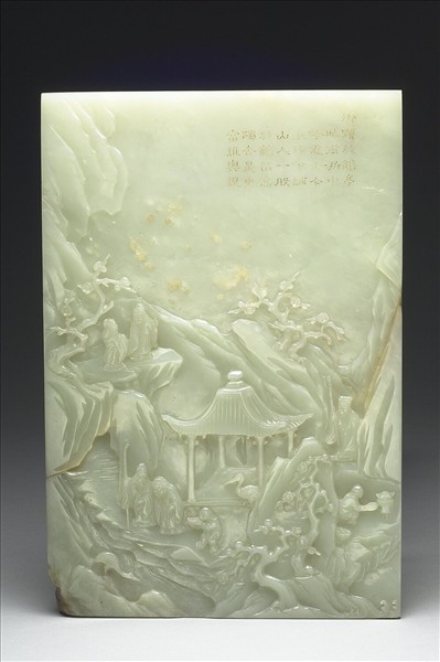 青玉質。雙面浮雕山水人物,並陰刻隸書乾隆題景詩,兩文士相偕觀鶴,一老者從後緩行而來,另有二人登高眺遠。留白處陰刻隸書:「御題放鶴亭 昨甫浙中吟處士,今來徐下緬山人。一股(般)放鶴留高躅,舍是更當誰與親。」詩錄於《清高宗御製詩文全集‧御製詩三集》卷二十四頁四,〈題放鶴亭〉壬午(乾隆二十七年,1762)。另面,兩文士緩步對談,童子隨侍。留白處陰刻隸字:「御製煙磴第亭 隔溪一㡠遠山青,石磴攀登俯碧汀。四柱漫言缺題額,故知得號問春亭。」
