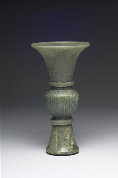碧玉帶瑕斑。瓶仿觚形,敞口,圓腹,喇叭式足。此器口、足沿及頸、腹、足之交界處皆飾回紋一圈,頸、足飾仰覆蕉葉紋,腹飾直棱紋和變形蓮瓣紋。器從頸下與器身及器足處作三段兩處接榫結合。香爐、⼀對燭臺、⼀對花瓶合為「五供」,為佛前供器。