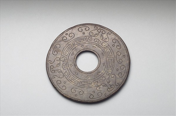 玉質,原色不詳,全染成紅褐色。圓片形,有中孔。兩面均陰線刻花紋,內外緣各刻陰線一周,一面由內而外有三角形紋、回紋、獸面紋及雲紋,另一面刻兩隻雙身異獸,尾端相纏,獸面呈倒三角形。