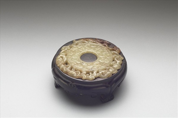 玉質,青黃色,有褐色斑。系璧,中孔不正,內、外廓線之間一面滿琢雲紋、一面琢動物紋;壁緣外透雕三隻螭龍與靈芝。附木座。
