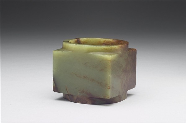 玉質,黃綠色,帶赭斑。琮,內圓外方,中孔貫穿上下,上下有射口。全器光素無紋。