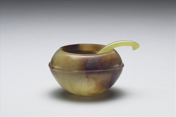 玉質,青色,有褐紅色斑。圓形似缽,縮口,歛腹。口沿下三分之一處琢一道弦紋。附玉杓。