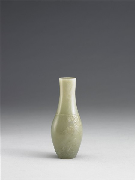 青玉。圓形瓶,平口,圓腹歛下,平底。腹淺浮雕松、雙鹿、山石。