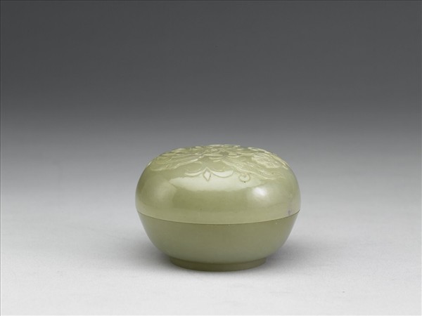 青玉。母子蓋扁圓盒,有圈足。平蓋頂淺浮雕番蓮花葉。
