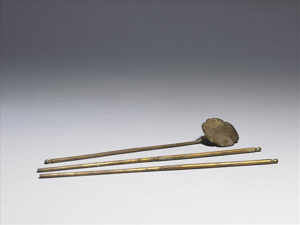 為「清 ⽟⼦⺟螭紋⼩瓶」(中玉380)的附件。鍍金銅箸、鏟。鏟面為四瓣花海棠形。銅箸,即銅筷,用來從香盒內夾出香塊;銅鏟,用來鋪平爐灰。