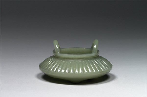 青玉。平口,短頸,腹作二折式,上段飾直棱紋,下段光素無紋,三個乳丁式小足,兩耳立於口緣上。