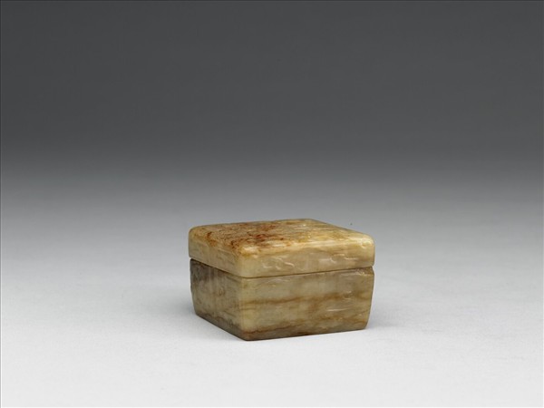 灰黃玉,有赭斑。盒蓋略短於器身,器身微向下歛,蓋面淺雕雲紋。