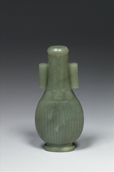 青綠玉。扁瓶,平口,口緣微向內斂,長頸,圓腹,雙貫耳,圈足。頸飾蕉葉紋,腹上方琢渦紋一周,下接直棱紋。
