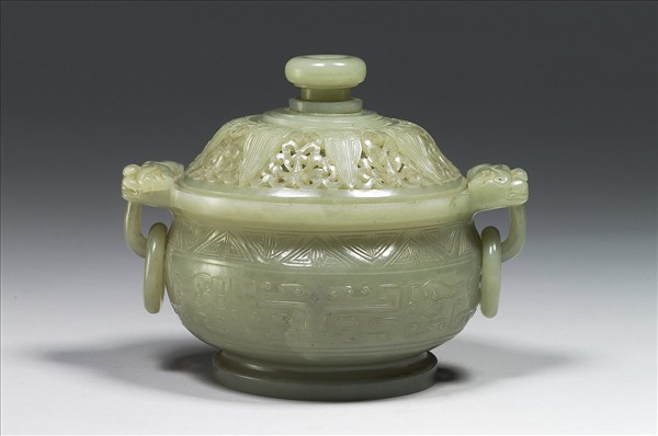 青灰玉,附玉蓋,口微侈,圓腹,圈足,兩耳懸活環。蓋面鏤空番蓮花、八枚蟬紋,頸飾三角紋一圈,腹浮雕獸面紋,兩耳雕獸首。