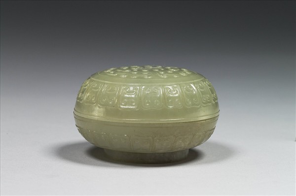 青玉。圓盒,有圈足。蓋頂中央琢雲紋,蓋沿及盒壁各雕蓮瓣紋一周。