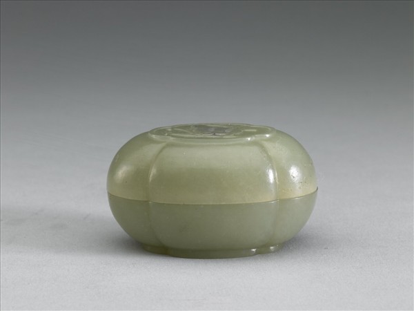 青玉,光潤。四瓣海棠花式盒,蓋與器身相等,圈足。蓋面浮雕鳥啣樹枝。