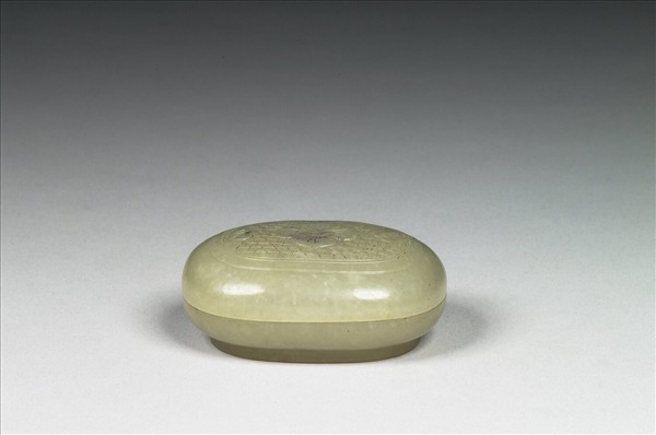 青玉,泛黃色。扁橢圓形盒,圈足。蓋面淺浮雕四瓣花填六形角朵花地。