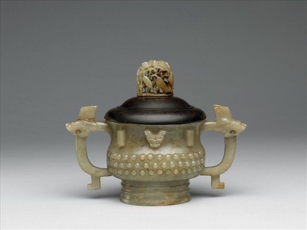 青玉。仿青銅簋形,圈足。雙龍耳,頸高浮雕獸面,有棱脊,腹飾乳丁紋。附木蓋,上有鴛鴦荷葉玉頂。