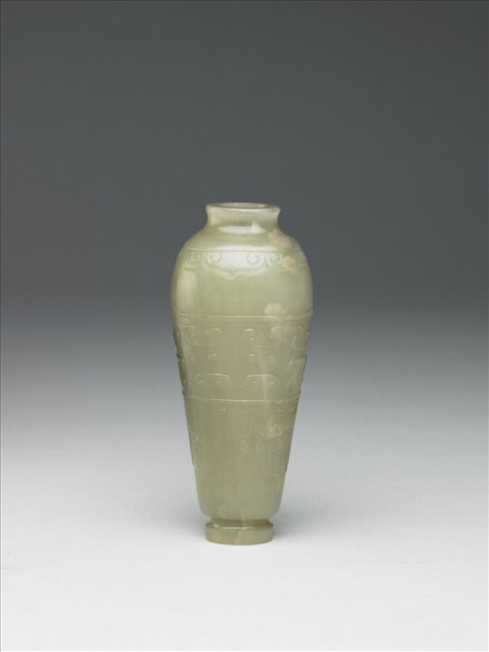 青玉。平口,短頸,長腹,圈足。腹分三段,上、中段淺浮雕雲紋,下段琢蕉葉紋。