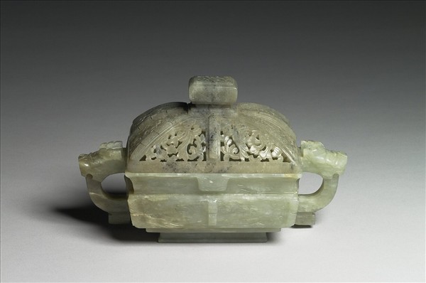 方爐,雙龍耳,方圈足。器身淺浮雕獸面紋。玉蓋有方形鈕,蓋面飾鏤空花葉紋,八條棱脊自鈕輻射而出。