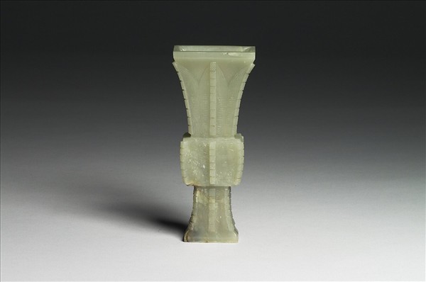 青玉。仿青銅觚形瓶,長方形口、足。上、下皆飾蕉葉紋,中段淺浮雕獸面紋,六條棱脊,上飾菱格紋。