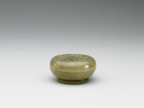 青玉。扁圓形盒,圈足,蓋與器身相等。蓋面淺浮雕雙龍,中央刻一太極陰陽圖。