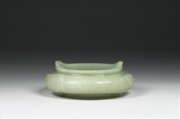 青玉,光潤。扁圓形爐,三小足,雙耳自口沿上方突起。腹淺浮雕幾何化雲紋,以回紋為底。