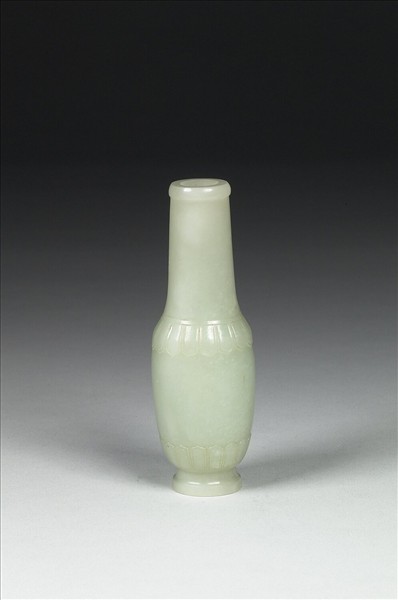 青白玉。歛口,長頸,長圓腹,圈足。腹淺浮雕上下兩排蓮瓣紋。
