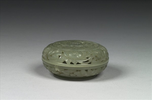 青綠玉,帶灰色。扁圓盒,圈足。全器鏤空番蓮花葉紋。