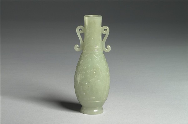 青玉。平口,長圓腹,雙耳,高圈足。頸淺浮雕蕉葉紋,腹琢雲紋、菱形方格組成之變形獸面紋,雙耳作雲紋。