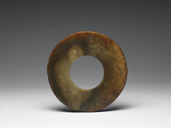 灰青色玉質,「糖包白」玉料,全器已盤紅潤澤。環形,尚稱圓整。外緣有大小不一崩傷後的磨平,孔單面鑽後再從另一面磨飾,一端削薄一角,或為祭祀或墓葬遺痕。
