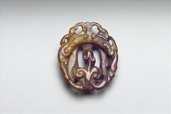 青玉,表面滿布褐斑,質地溫潤。器作橢圓形,一面平而一面圓凸。全器以鏤雕、淺浮雕技法刻滿雲紋,線條流動間隱約勾勒出螭獸身形。應屬明晚期仿偽古玉,但褐斑可能在十八世紀時加深。