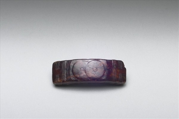 玉質,深棕黑色有光澤。長方形器,側視為弧形片狀,凸面二端各陰刻直線二束,中琢交疊圓璧形二,凹面光素無紋,二端各有一象鼻穿。本件疑為用新石器時代晚期玉圈(鐲)的殘件,兩端加鑿小隧孔,凸面加琢仿古紋飾,全器深染褐紅色。雕紋與染色的工序可能是十八世紀時所作。現收藏於飾錦袱紋扇形金色蒔繪漆盒,其中並有檀香木座。