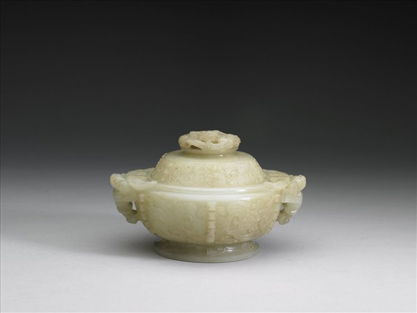 青玉簋形爐,有圈足,耳作牛角獸立雕,有蓋,蓋上有鈕。蓋及腹部淺浮雕飾幾何夔鳳紋,並有棱脊。蓋鈕為一盤龍,口啣番蓮。