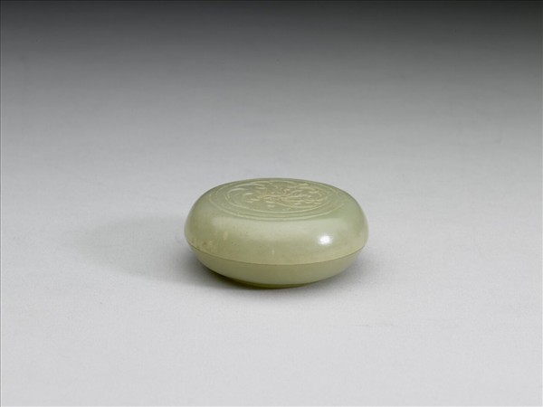 青玉小圓盒,有綹。蓋與器身略相等,弧形壁,有圈足。蓋面飾有番蓮卷葉紋。
