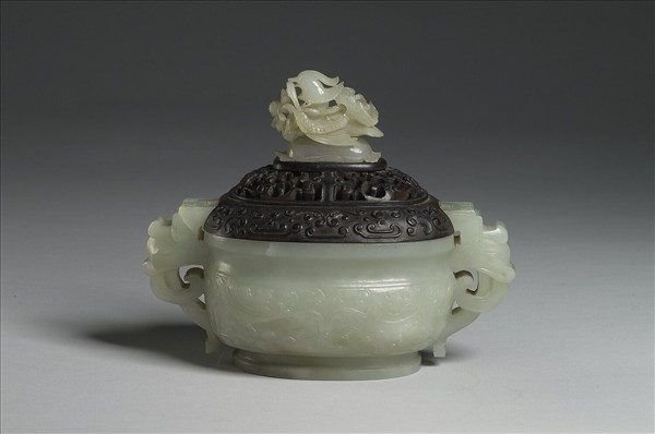 青白玉簋形爐,獸首形耳,有圈足。附木蓋玉頂,玉頂年代為元代。腹飾有淺浮雕獸面紋。