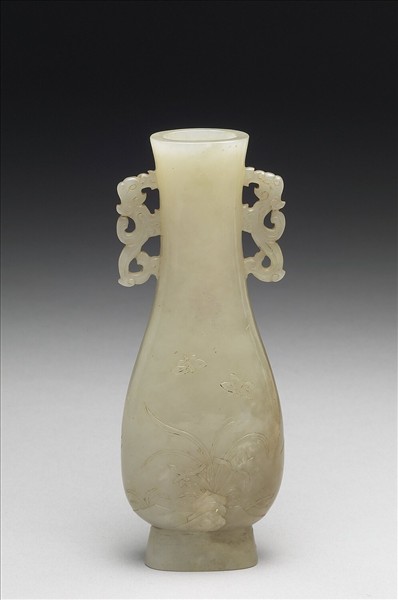 玉質,色青灰,有白色斑紋與璺。直口微撇,長頸,深腹,圈足,鏤雕龍獸為雙耳。器身扁圓,器腹淺浮雕山石上蘭花草二株,上有蝴蝶飛舞。瓶是用來放置筷及鏟,與爐、盒三件成組。