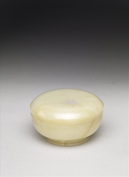 青白玉,有裂璺。子母口,平頂蓋,弧形壁,圈足。蓋與器之口緣各陰線刻連續工字形紋一周,其餘光素。盒用以盛裝香料,與爐、瓶三件成組。