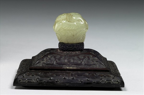 附件 方形木蓋,玉頂作球形,玉色青泛黃,琢磨一獸於雲彩上。