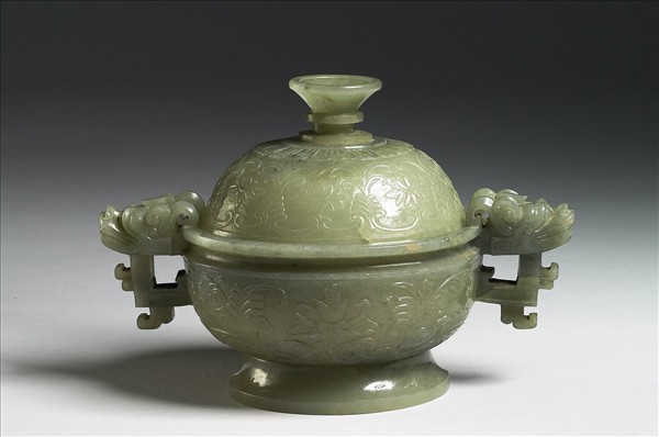 青灰色玉。簋形爐,有蓋,蓋頂的鈕作喇叭形,二耳作立雕獸首,圈足。蓋及腹飾番蓮花葉,蓋頂下方琢蓮瓣一周。腹壁有一長璺。