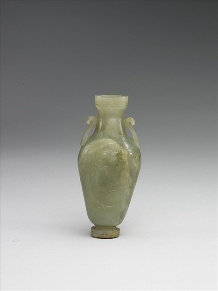 扁瓶,侈口,斂腹,圈足。透雕雙耳,口沿飾回紋,腹琢獸紋。