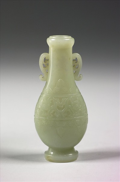 青白玉,扁瓶,口緣具厚圓邊,長頸,圓腹,雙耳,圈足。腹飾由卷葉紋組合而成之幾何化獸面紋,上下琢仿古蟬紋,雙耳鏤空卷葉紋。