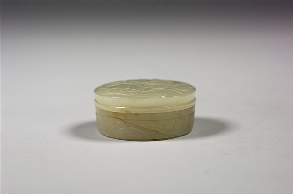 青白玉,圓盒,平頂,直壁略向下傾斜。蓋面及盒壁淺浮雕荔枝、枝葉,荔枝以數種幾何紋裝飾。