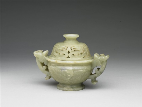 青玉,泛綠色。玉蓋,雙提耳,圓腹斂下,圈足。蓋鏤空鳳鳥紋,身軀蜿蜒交疊,腹飾簡化獸面紋,雙耳琢龍首。