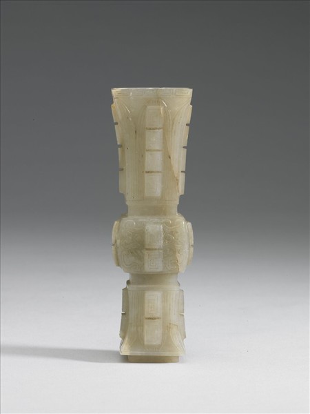 青玉,觚形瓶。橫截面作扁長方形,有棱脊。口沿飾回紋一周,棱脊上琢回紋,上、下段琢蕉葉紋,中段以獸面紋飾。