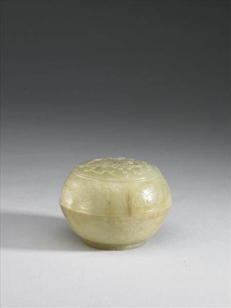 青玉,圓盒,平蓋,圓腹下歛,圈足。蓋頂浮雕番蓮枝葉,盒壁陰線刻纏枝番蓮。