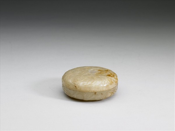 灰黃玉圓形扁盒,蓋與器身略相等,弧形壁。蓋面與腹部淺浮雕荔枝與枝葉。灰黃斑有綹有璺,裂璺有赭沁。