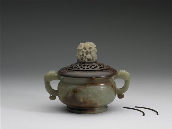 青玉簋形爐,有大片沁染赭斑。附玉頂木蓋,兩提耳上各有一獸首,圈足。腹部一圈淺浮雕獸面紋。木蓋鏤空作卷草紋,玉頂為元代作品。