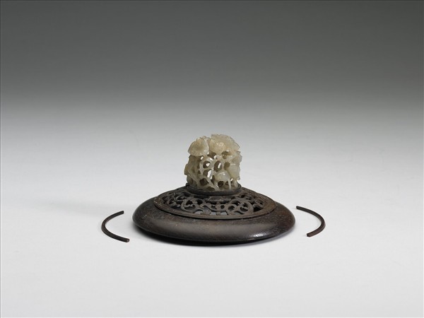 附件 木蓋玉頂,白玉泛黃,玉頂鏤雕荷花葉與鷺鷥。木蓋鏤空作卷草紋。