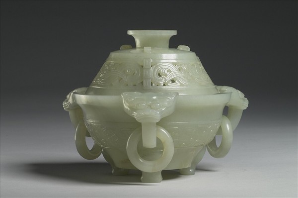 青玉香爐,有少數白綹。附蓋,三耳,耳做立雕獸首,下接活環,三足,蓋與器身皆為斜壁。蓋面以鏤空飾一首雙身龍紋,腹部為獸面紋。