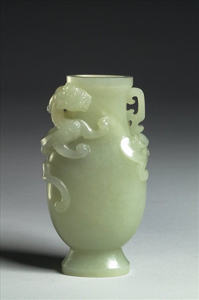 青玉扁形瓶,圈足。二耳鏤空作雲紋,頸肩部攀爬二神獸。