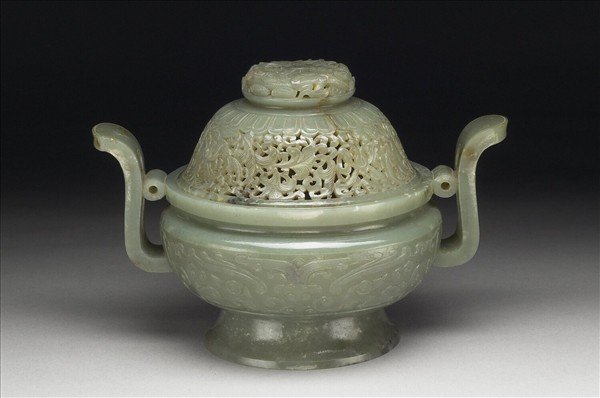 青玉,帶灰白、赭色斑紋。爐帶蓋,子母口,朝冠耳,高圈足。器腹淺浮雕獸面紋,雙立耳與口沿相接處琢小圓管,蓋鈕為鏤雕盤龍,蓋面以鈕為中心陰線刻花瓣一圈,以下皆鏤雕纏枝蓮花紋。香爐用以焚香,與瓶、盒三件一組。