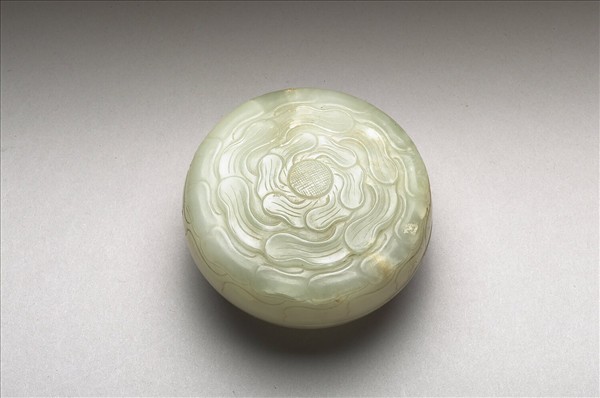 青玉,色青白有灰白及赭白瑕紋斑。盒子母口,弧形壁,淺圈足。蓋淺浮雕盛開花卉一朵,網格紋花心,盒身光素無紋。盒用以盛裝焚香料,與香爐、瓶三件成組。