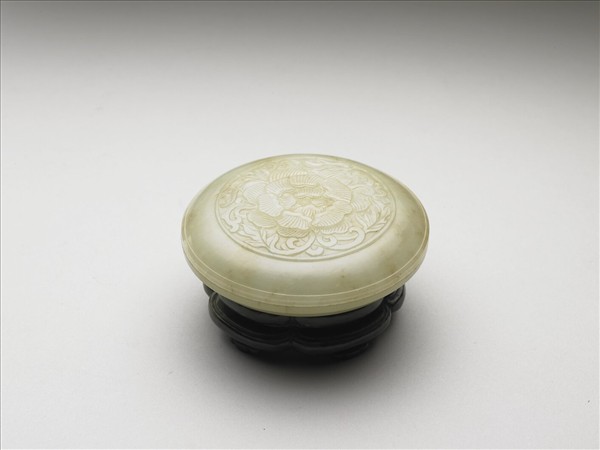 青玉,玉色青白光潤,部分有赭色瑕斑。平頂蓋,子母口,弧形壁,圈足。蓋面琢弦紋二圈,內飾折枝牡丹花葉紋。附碧玉質底座。盒用以盛裝焚香料,與香爐、瓶三件成組。