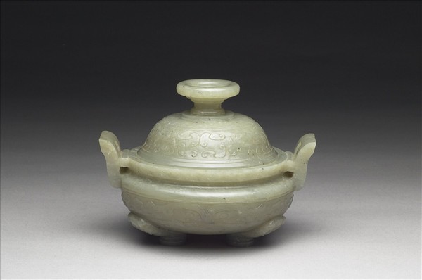 青玉,色灰青有灰白及黑色斑點。折沿,束頸,碩腹,朝冠形耳,帶蓋,蓋上有鈕,三獸足。器身及器蓋均雕飾變形獸面紋。香爐用以焚香,與瓶、盒三件一組。
